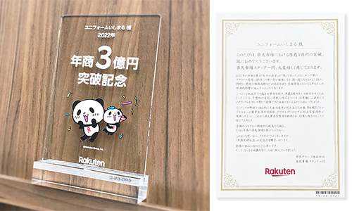 この度「ユニフォームいしまる楽天市場店」の年商3億円突破を記念して、楽天グループ株式会社様より記念の盾をいただきました。